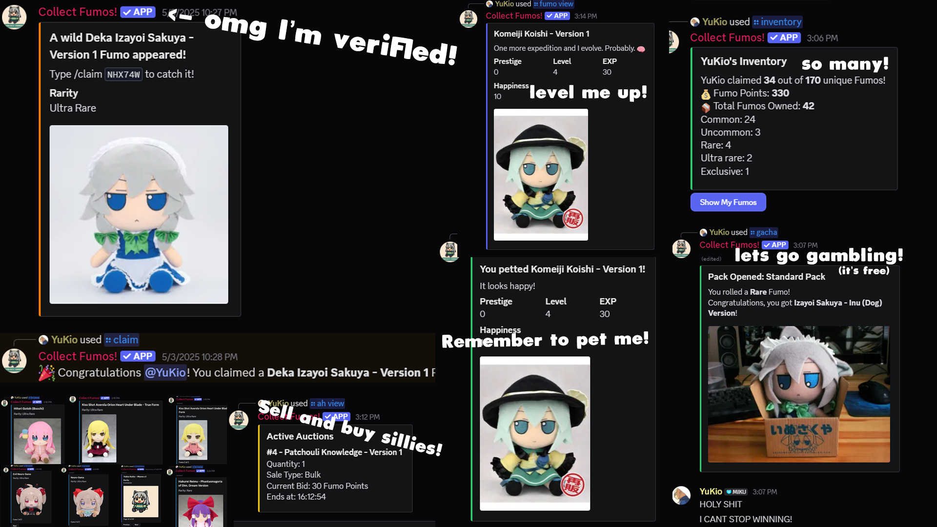 Collect Fumos! is a funny, cozy, and slightly chaotic Discord bot where you can collect all your favorite Fumos! Built with love (and a lot of silliness), this bot lets you collect, raise, gift, and compete using an ever-growing collection of adorable Fumos.
